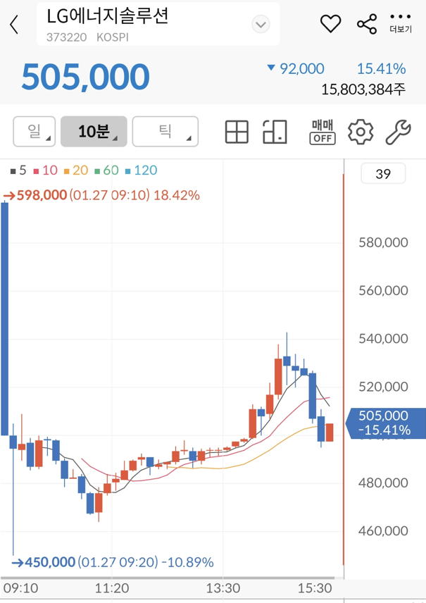 결국 1/27일 lg에너지솔루션 상장 당일 종가는 505,000원으로 마무리 되었습니다.