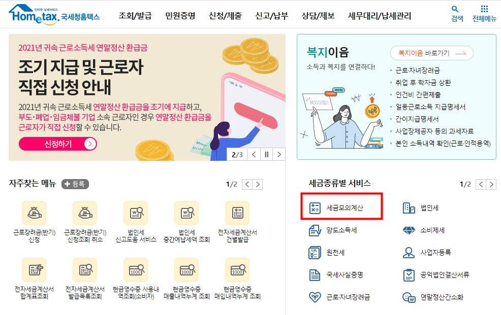 국세청> 세금종류별서비스 > 세금모의계산 클릭