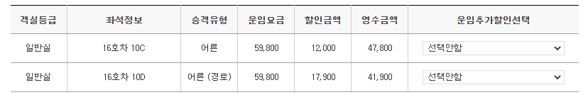 최종 결제 과정에서 보면 위와 같이 만65세이상을 선택하고 예약을 하면 경로우대 할인이 적용된걸 알 수 있습니다.