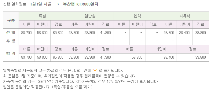 특실, 일반실 모두 어린이 할인과 경로할인 요금이 있다는것을 알 수 있습니다. 자유석도 어린이 할인, 경로 할인이 있네요. 장거리를 갈 경우 기차요금이 생각보다 비싼데 이런 할인 제도를 이용할 조건이 된다면 최대할 이용하시는게 좋습니다.